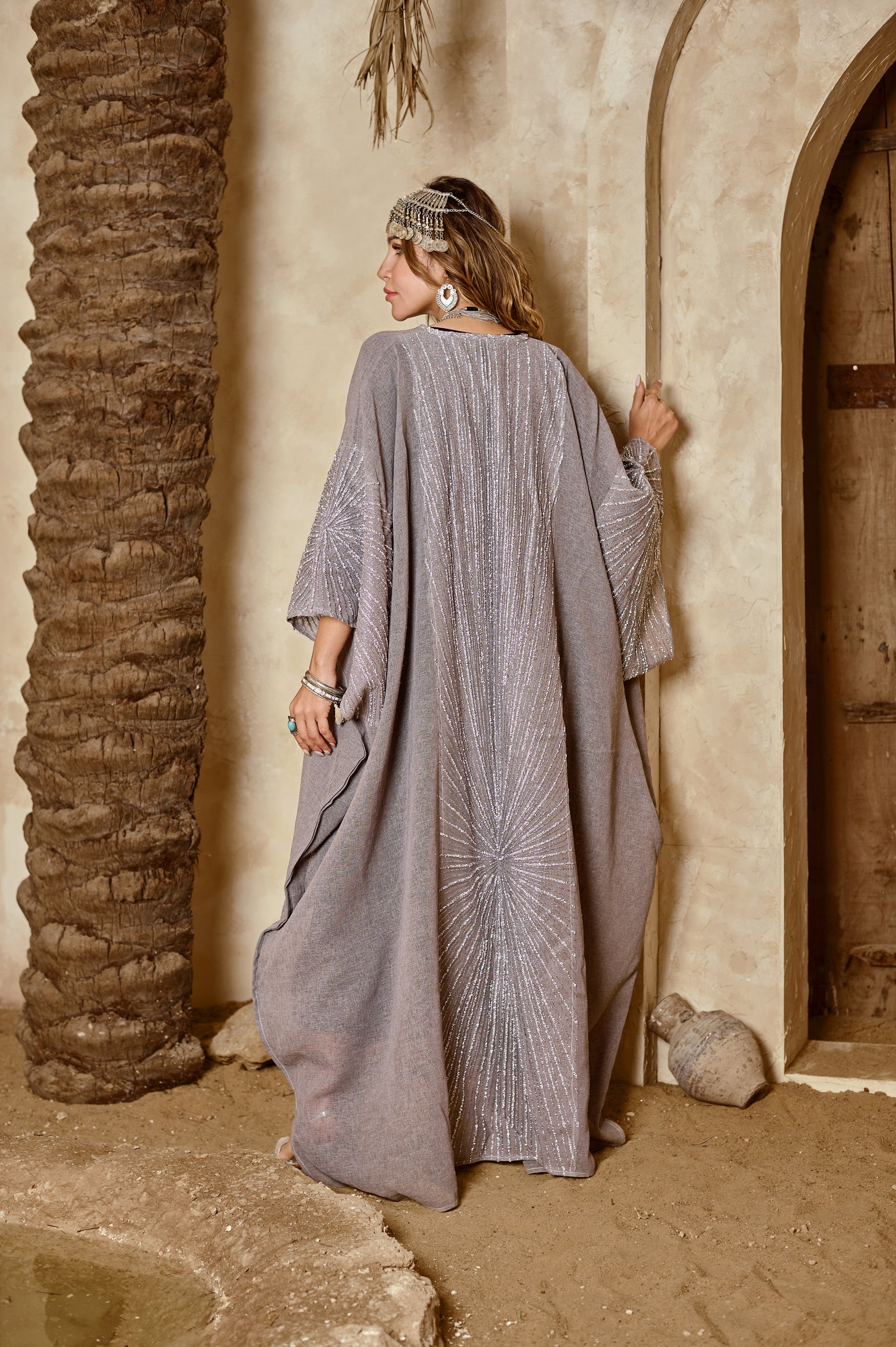 Lujain is inspired by flowing silver light. With its wide silhouette and shimmering sleeve details, this kaftan offers comfort without compromising elegance. A bold yet relaxed design that celebrates movement, confidence, and contemporary heritage.