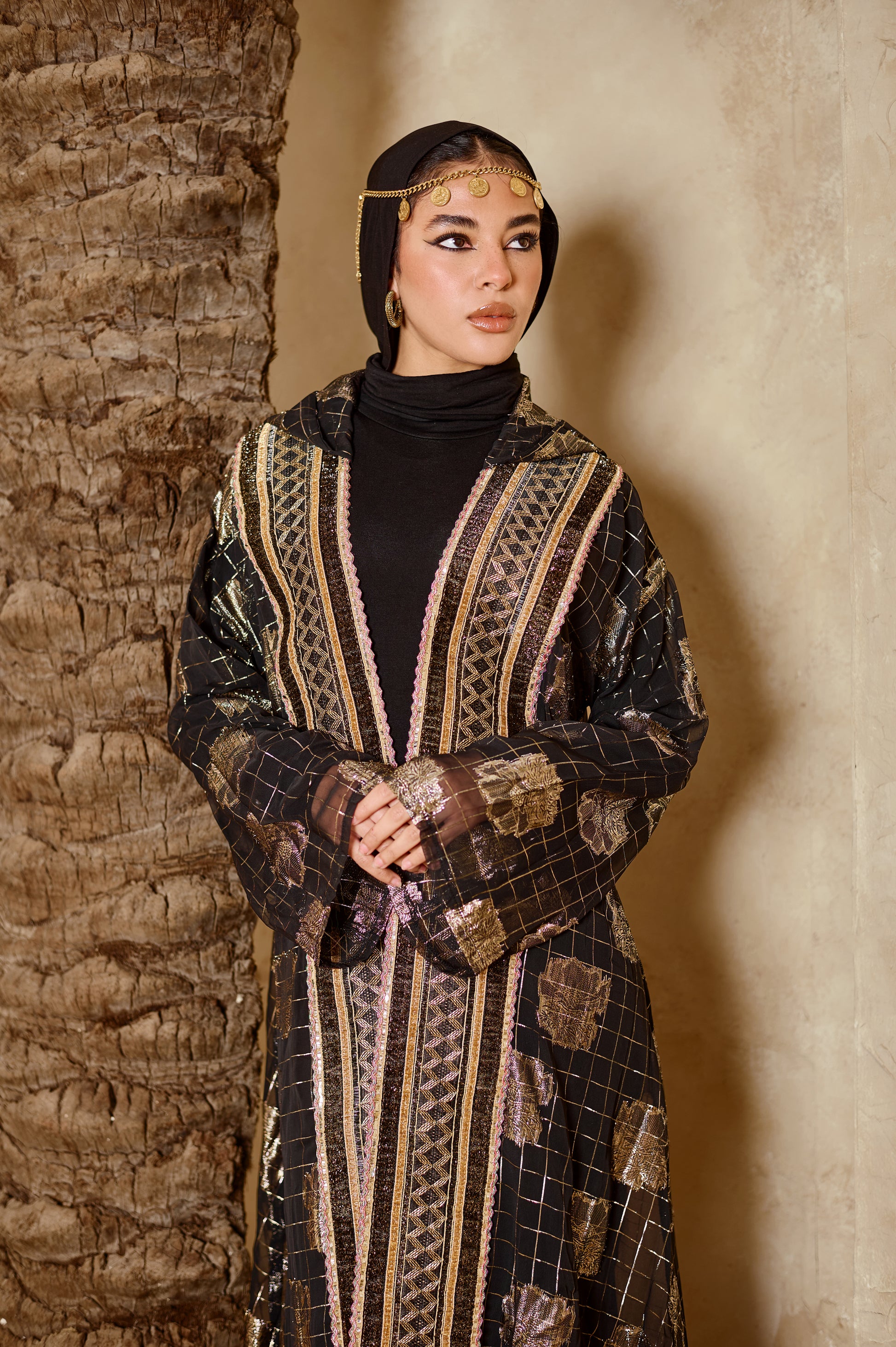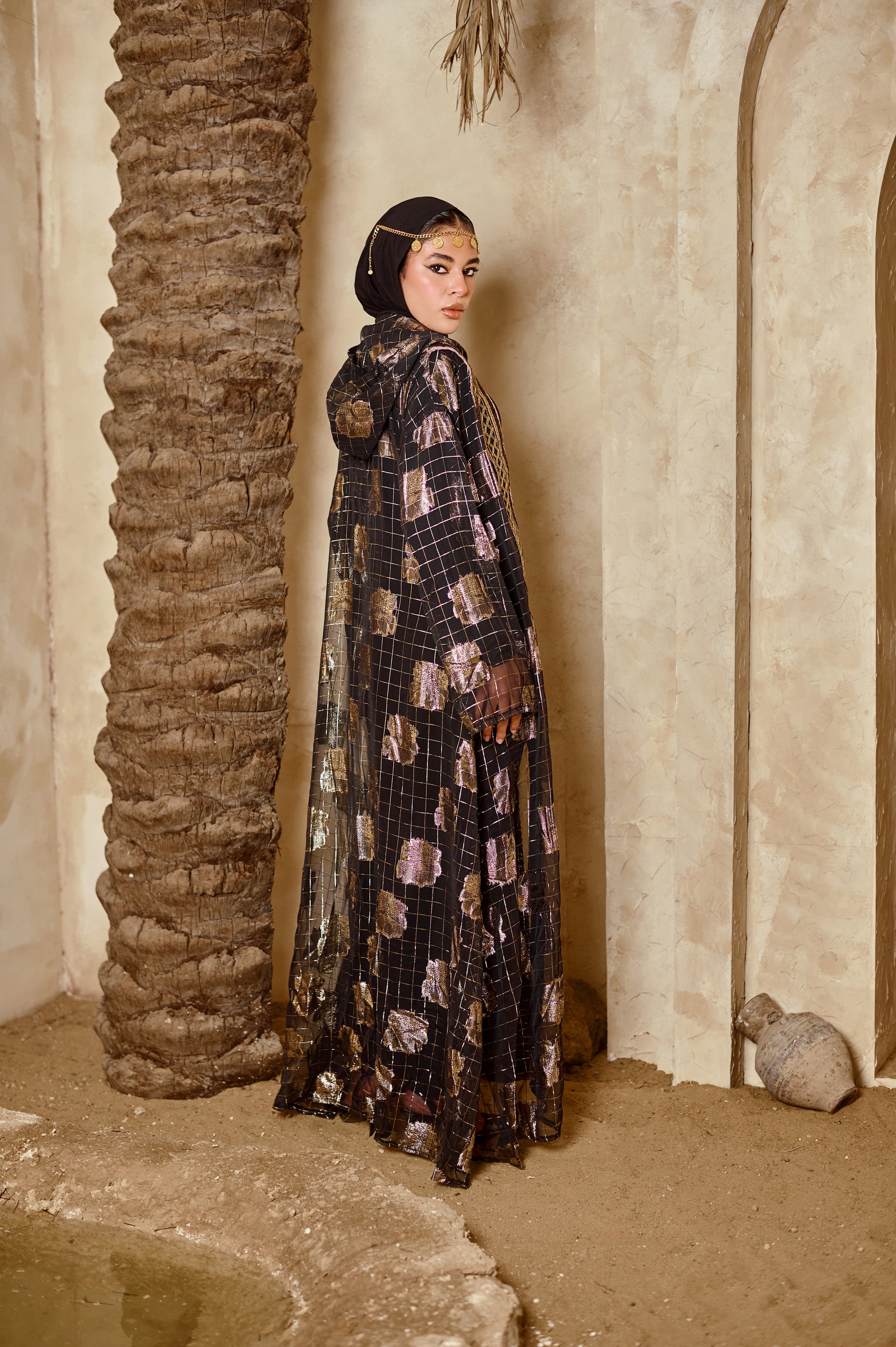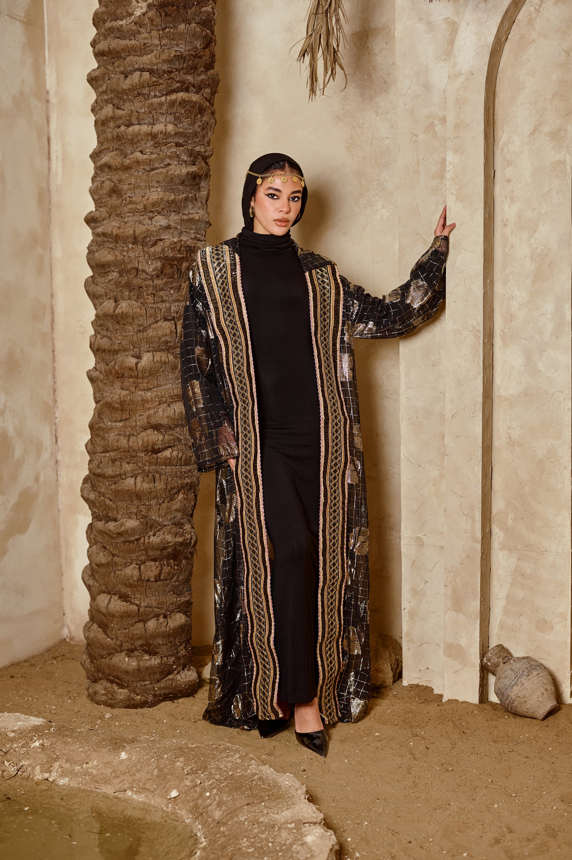 Sultana Noir is the definition of modern royalty. Featuring sheer embroidered fabric layered over a sleek black base, this kaftan is finished with intricate golden detailing that elongates the silhouette. Powerful, graceful, and unforgettable—this piece is made for women who embrace elegance with strength.